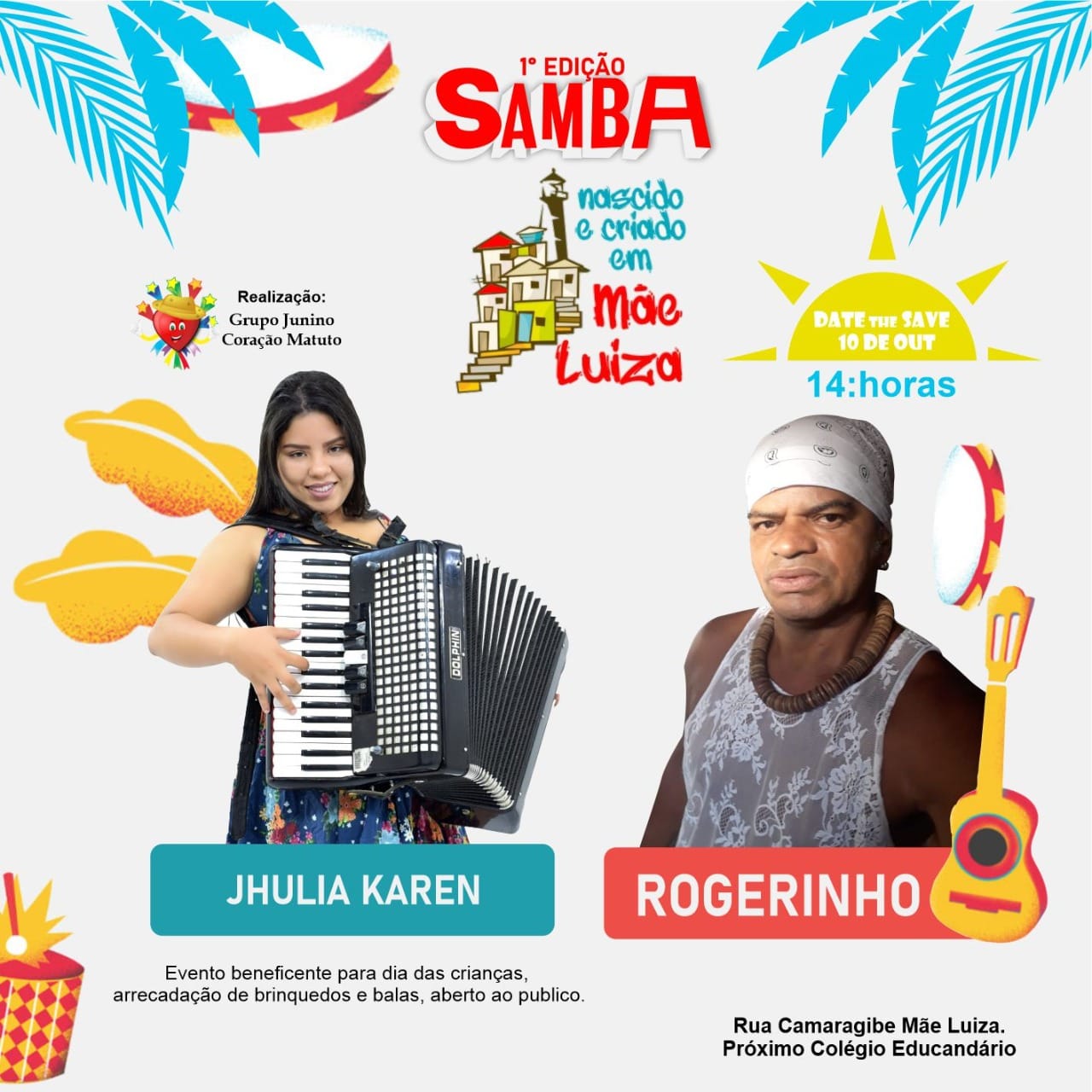 Domingo que antecede os festejos do Dia da Criança e o feriadão da padroeira do Brasil, o Grupo Junino "Coração Matuto" do amigo Renato Bezerra, vai realizar a primeira edição do projeto: "Samba Nascido e Criado em Mãe Luiza".